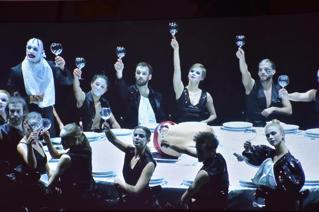 I get the loveliest sensations listening to Nits music: it makes me think and feel, long and muse, regret and hope, dream, feel happy. All these different moods Nits evoke so effortlessly in their music are very difficult to transpose to the dance movements. Music has a way of touching the soul that is quite unique, Nits music especially, and the abundance of manoeuvres and gestures, and the hectics of the busy dancers don’t always leave enough space for us to undergo these moods and be taken in by them. The sense of melancholy in Nits music perhaps most of all suffers from the “buzziness” on stage. Melancholy needs the pause, the quiet of a moment of reflection, a sort of focus of the mind, standing still while still moving in time. Music can provide this sort of moments, dance can too, but only seldom. I think “The Swimmer” comes closest here to expressing the feeling of melancholy and longing, beautifully danced by the two star dancers from Scapino, the wonderful Bonnie Doets (whose big wistful eyes and distinctive looks make her a dancing actress) and her swimming partner, – and maybe also the protagonist and narrator of this charming dancing tale – the multifaceted Mischa van Leeuwen. The opening sequence of the show with the eerily unadorned, almost bare version of “ Two Skaters”, had, however, sketched so beautifully the kinship between music and movement. The song, emptied of its vocal lines, stripped to the bones, was merely brought to life by a few essential strokes and touches of the instruments, accompanying the chimerical, shadowy figures projected on the white curtains, a haunting allegory of images and sounds, revealing the intricate link between music and our imagination, between music and illusion, disclosing how beauty arises from the purest, most simply delineated rapport or exchange between two elements, between music and movement. Those cryptic, enigmatic lines of moving sounds and images, were a delicious appetizer for what was yet to come. It was like a portrait of rhythm, not only in sound, but also in vision, the slow movements of the dancers who metamorphose into stylists of rhythm. A cinematic suspense in Hitchcock style… But going through the motions, I started to get the feeling that Nits music agrees more with acrobatics than with dance movements as such. It must be their theatrical, often lingering, wandering, reflective style of making music that makes these acrobatic intermezzos so very suitable. “Around the Fish”, was delightfully pictured by the caterpillar girl on the rope, her swirling movements, diving and climbing, lending a tangible concreteness to this strange song, a palpability that suits Nits perfectly. The best choreographies were those that included some kind of objects; Nits love things, be it a rope, a big translucent ball, chairs or a table, a bicycle of some sorts, – a children’s tricycle to be precise – tableware, napkins and a tablecloth, anything really, – except for the hats maybe, there were too many of them too often, in a very cliché like manner, in a what-shall-we-do-next-with-the-hats? kind of way, not very Nitsy – that brings our everyday world into the dancers’ realm. Their down-to-earth matter of factness found a very unlikely and surprising partner in the acrobats whose controlled and rigid, statuesque movements offered a corporeality that goes very well with Nits’ picturesque but sturdy and kinetic sense of all things material. I must say the acrobatics were quite impressive: a Rapunzel girl hanging down from the rope only attached by her long hair, and the duet on “The Long Song”, the strength in the arms of the boy lying on the ground, and the grace and cautiousness of the girl he supported. But my favourite moment was “Walter and Connie” setting the table: the interaction of the dancers and acrobats with things like plates and glasses, napkins, chairs and the unfolding of the tablecloth were just charming. There should have been more moments like these in the show, with concrete, material references to our Lebenswelt. I imagined dancers picking apples from the trees, eating strawberries at the kitchen table … They should have brought more things to “Ting”, of all colours (not only blue things) and shapes, to play with, to dance with.